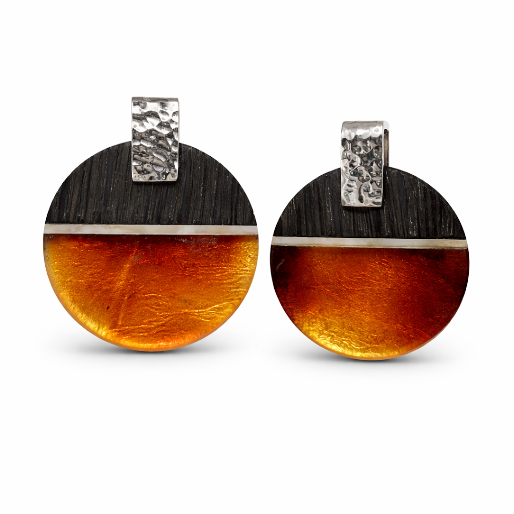 Wisiorek wykonany ręcznie z koniakowego bursztynu bałtyckiego, oprawionego w srebro wysokiej próby oraz szlachetne drewno czarnego dębu. Projekt dopełnia linia z jasnego, niemal alabastrowego bursztynu. Między drewnem a bursztynem umieszczono subtelną warstwę złota płatkowego, która dodaje całości elegancji i szlachetności.