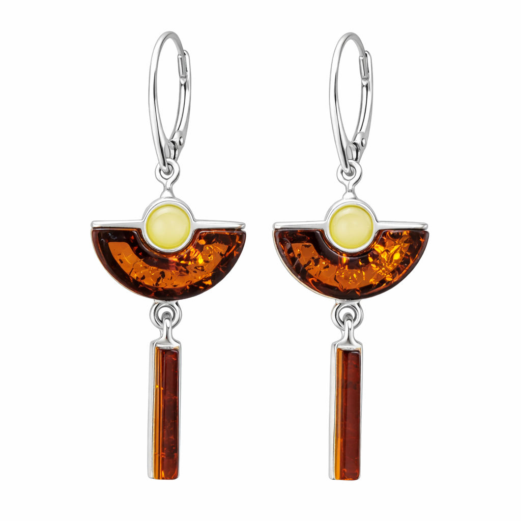 Wiszące kolczyki wykonane z bursztynu bałtyckiego w kolorach koniakowym i mlecznym oraz srebra 925. Wyjątkowe i ponadczasowe. Prezentują nowoczesną formę w kształcie półksiężyca, który symbolizuje kobiecość, delikatność i romantyzm.