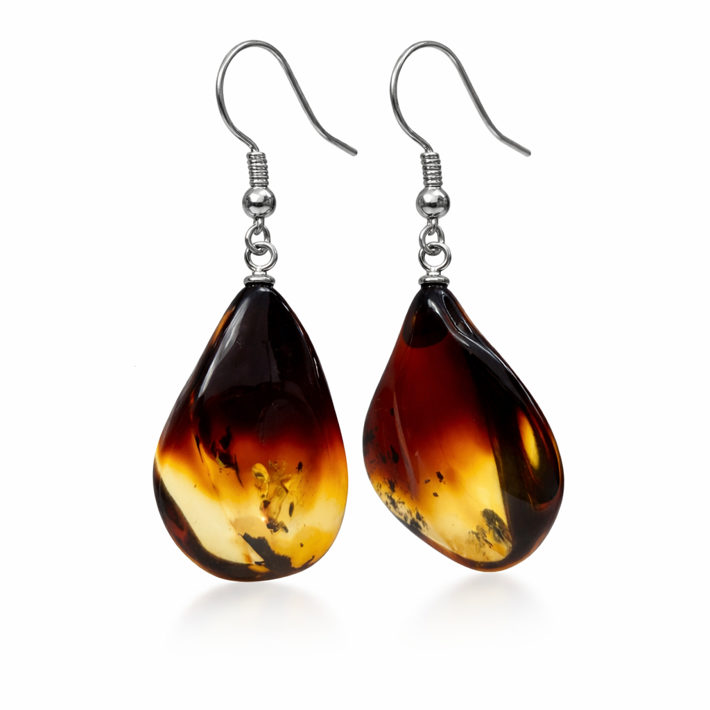 Unikatowe, wiszące kolczyki o falistym kształcie wykonane z bursztynu bałtyckiego w gradientowym kolorze od żółtego do wiśniowego i srebra 925.