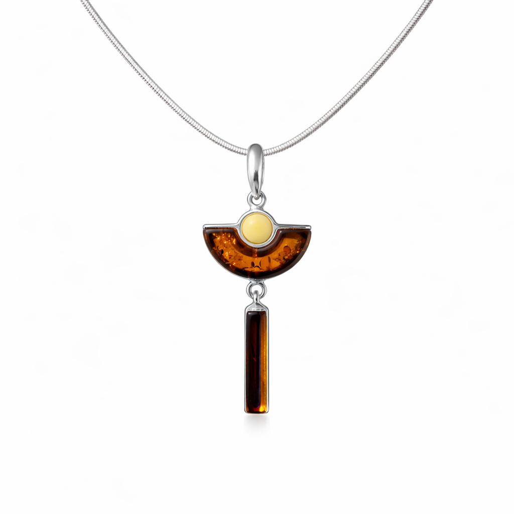 Wisiorek wykonany z bursztynu bałtyckiego w kolorach koniakowym i mlecznym oraz srebra 925. Wyjątkowy i ponadczasowy. Prezentuje nowoczesną formę w kształcie półksiężyca, który symbolizuje kobiecość, delikatność i romantyzm.