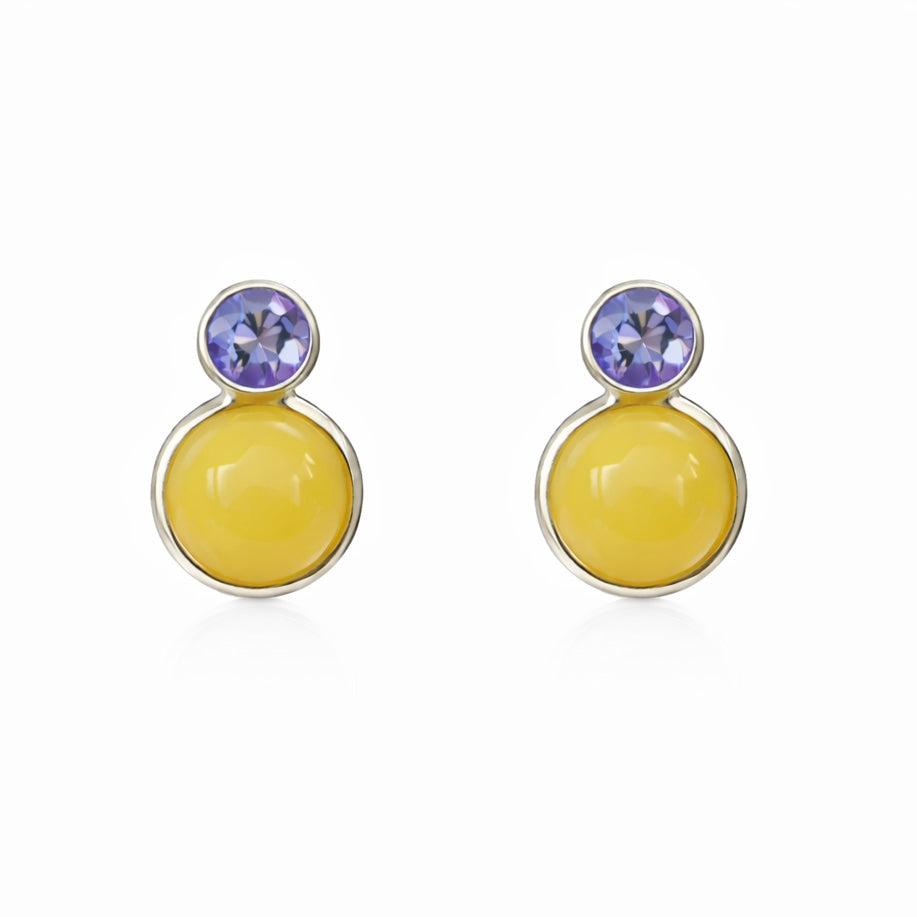 Eleganckie kolczyki sztyfty z żółtym bursztynem bałtyckim, szlifowanym ametystem i srebrem. Wyjątkowe połączenie bursztynu z pięknym, fioletowym minerałem.