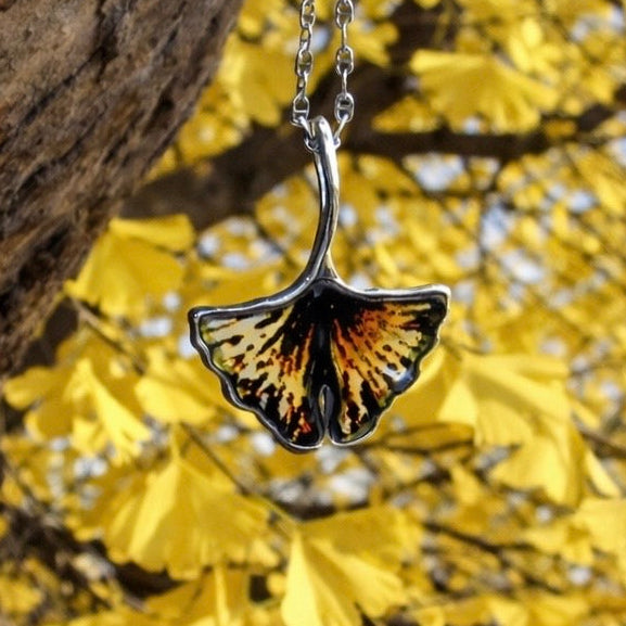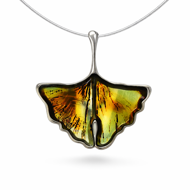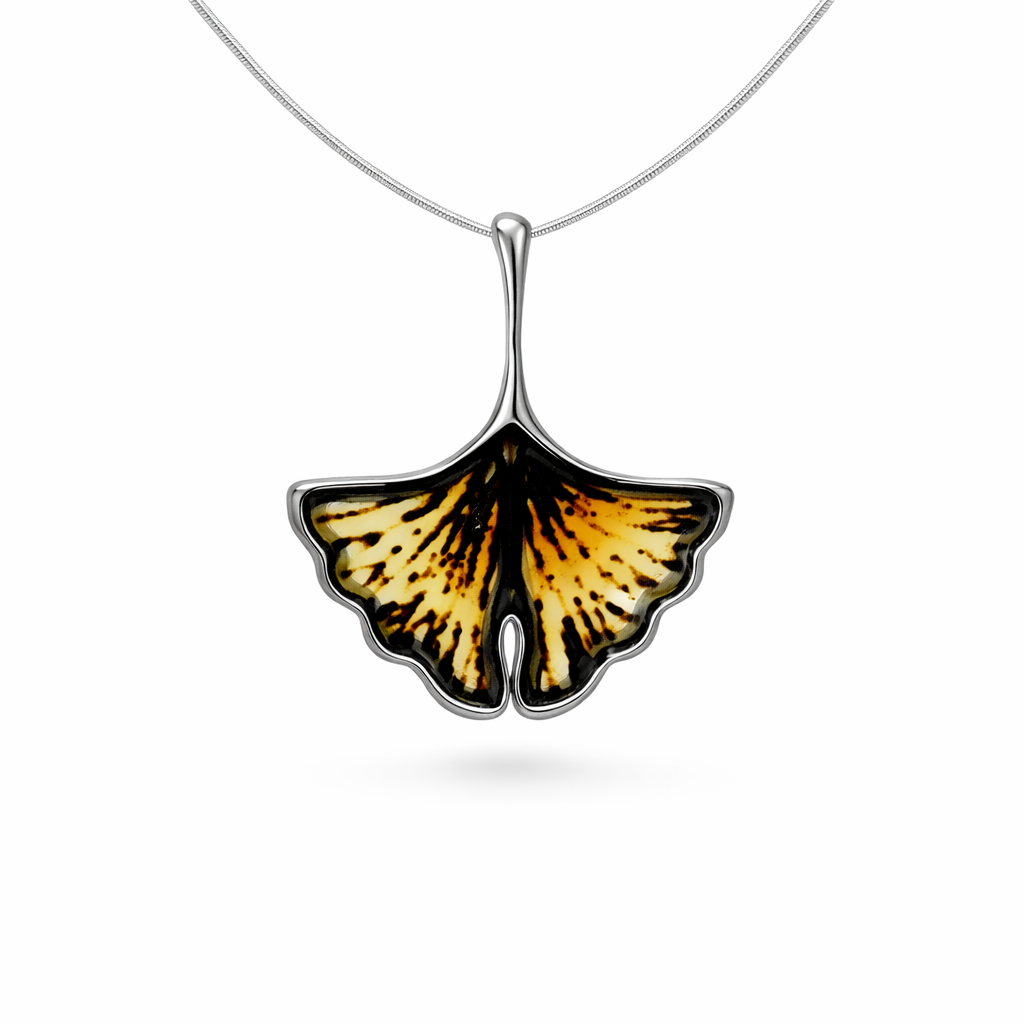 Wspaniały wisiorek inspirowany miłorzębem japońskim. Wykonany ze srebra 925 oraz koniakowego bursztynu bałtyckiego. Ta magiczna roślina nosi w sobie symbolikę siły, witalności, nadziei i braterstwa.