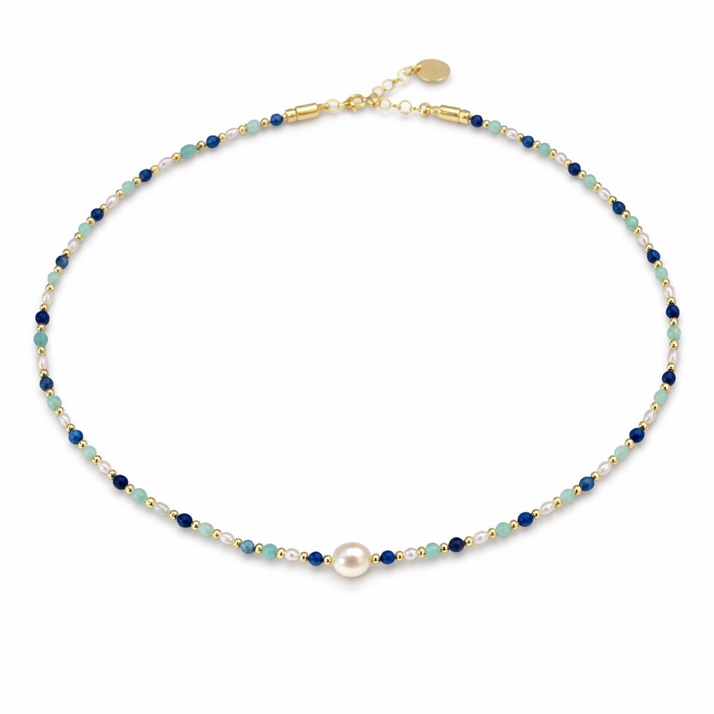 Wyjątkowy naszyjnik wykonany z granatowego lapisu, niebieskiego amazonitu, szarej perły i pozłacanego srebra 925. Delikatne połączenie stonowanych barw i piękno naturalnych minerałów.